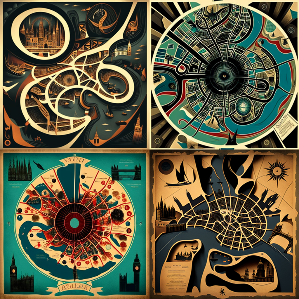 The prompts I used are mostly about cartography and maps, but also entirely random and silly stuff (e.g., Cthulhu at the British Parliament as a subtle political metaphor). You can see the results below, ranging from the hideous to the beautiful (at least to my non-trained eye). The prompts are visible in the file names. Some thoughts below.